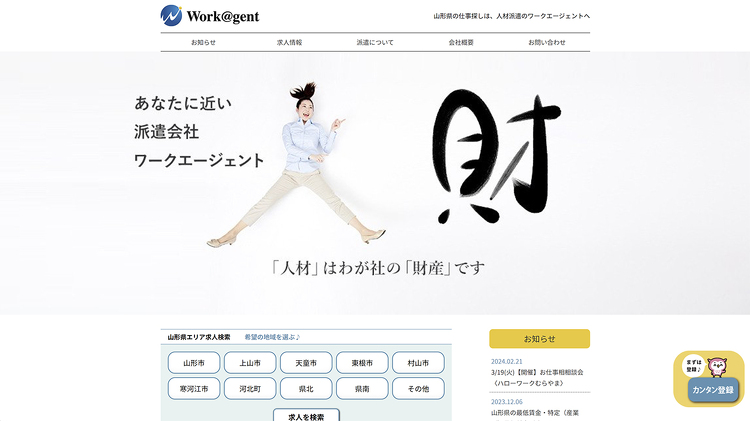 ワークエージェント株式会社は、「人こそが財産」であるという理念のもと、山形県を中心に人材派遣を行っている会社です。ウェブサイトでは求人情報を掲載しており、業種別、エリア別、おすすめ順に求人を探すことができます。